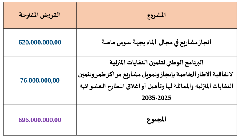 يسعى مجلس جهة سوس ماسة إلى اقتراض مبلغ بنحو 70 مليار سنتيم ( 696.000.000 درهما)، من أجل إنجاز مشاريع تتعلق بالماء والنفايات بالجهة.